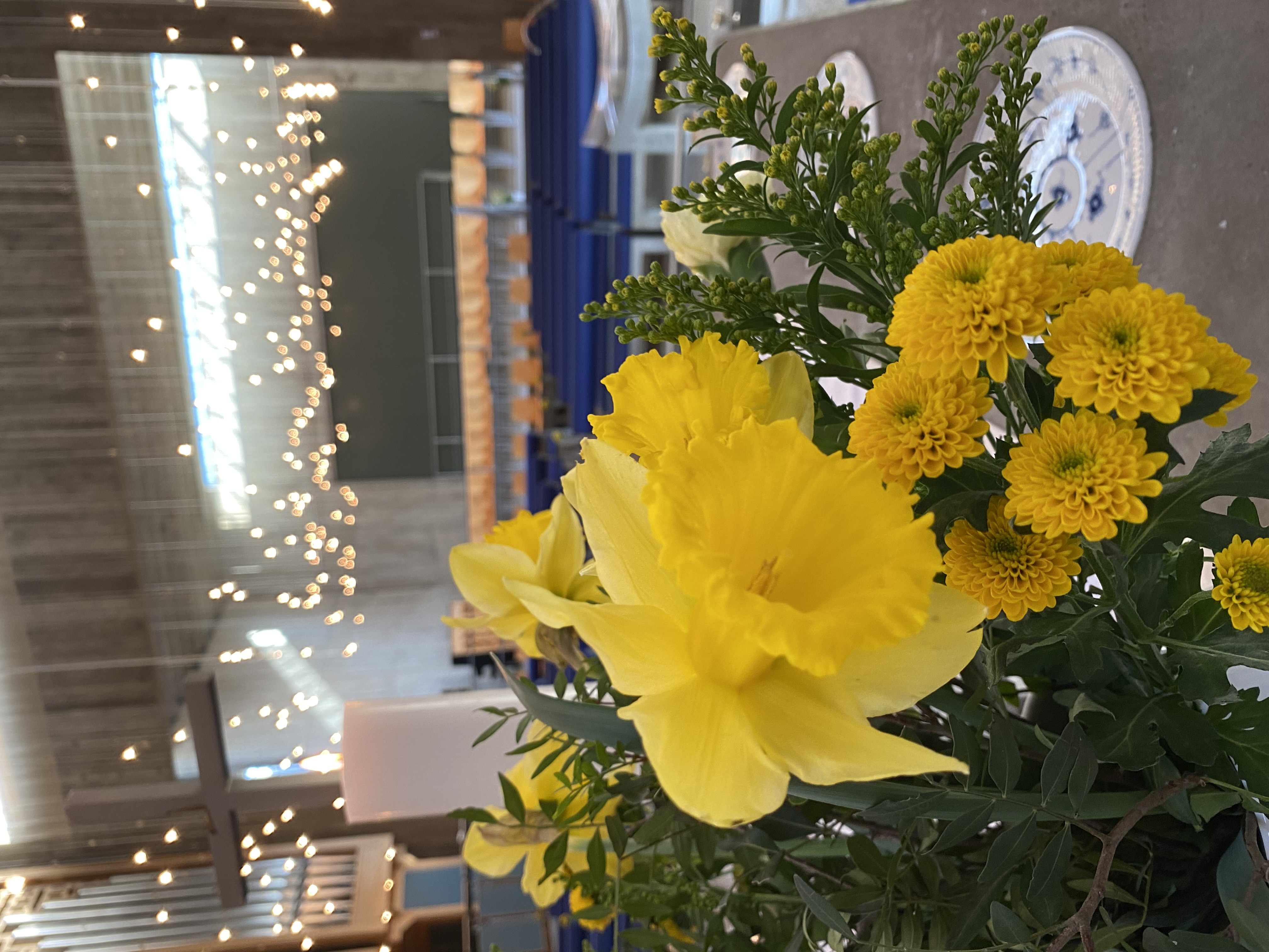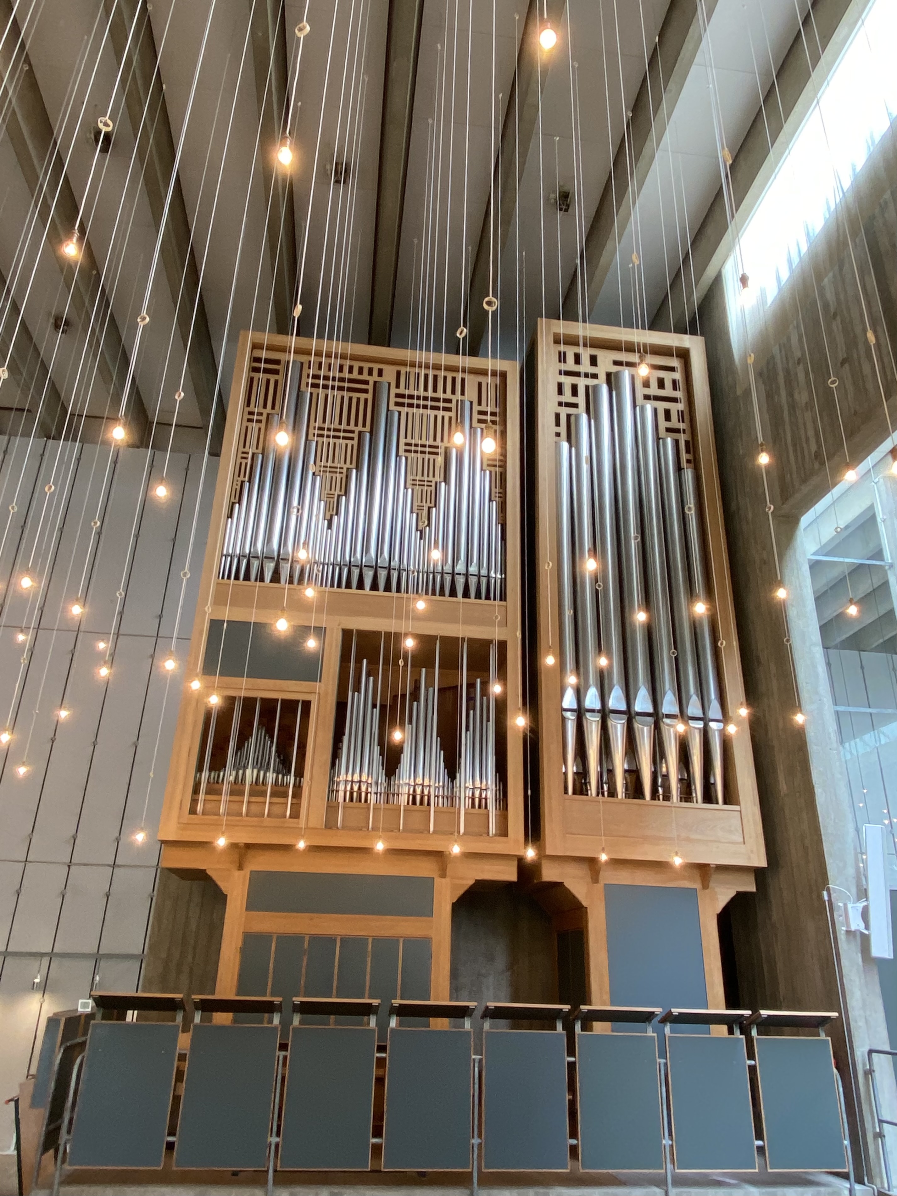 Kirkesalen og sideskibet belyses af et større antal uafskærmede bilpærer, nedhængt fra lofterne i varierende højder.