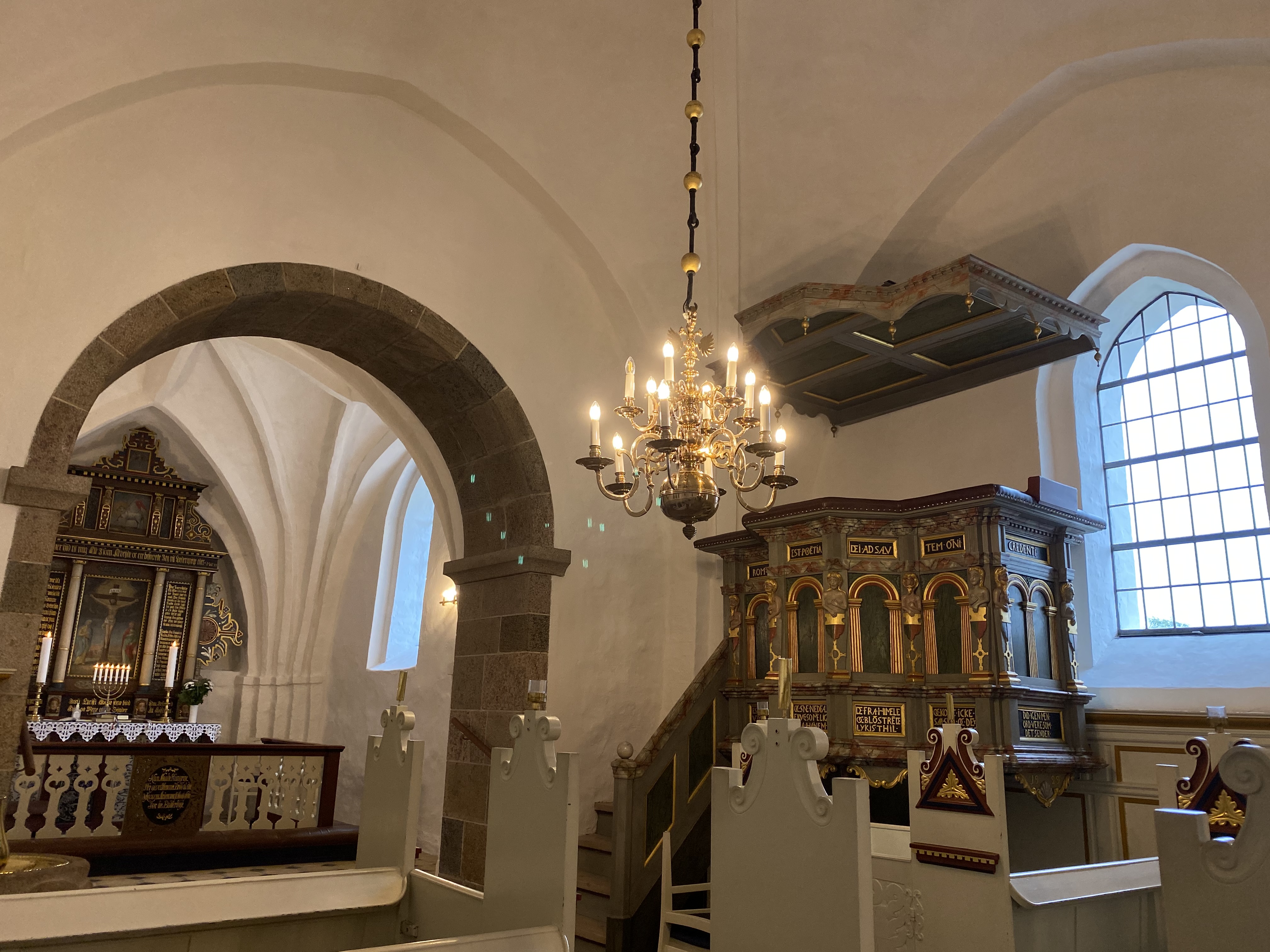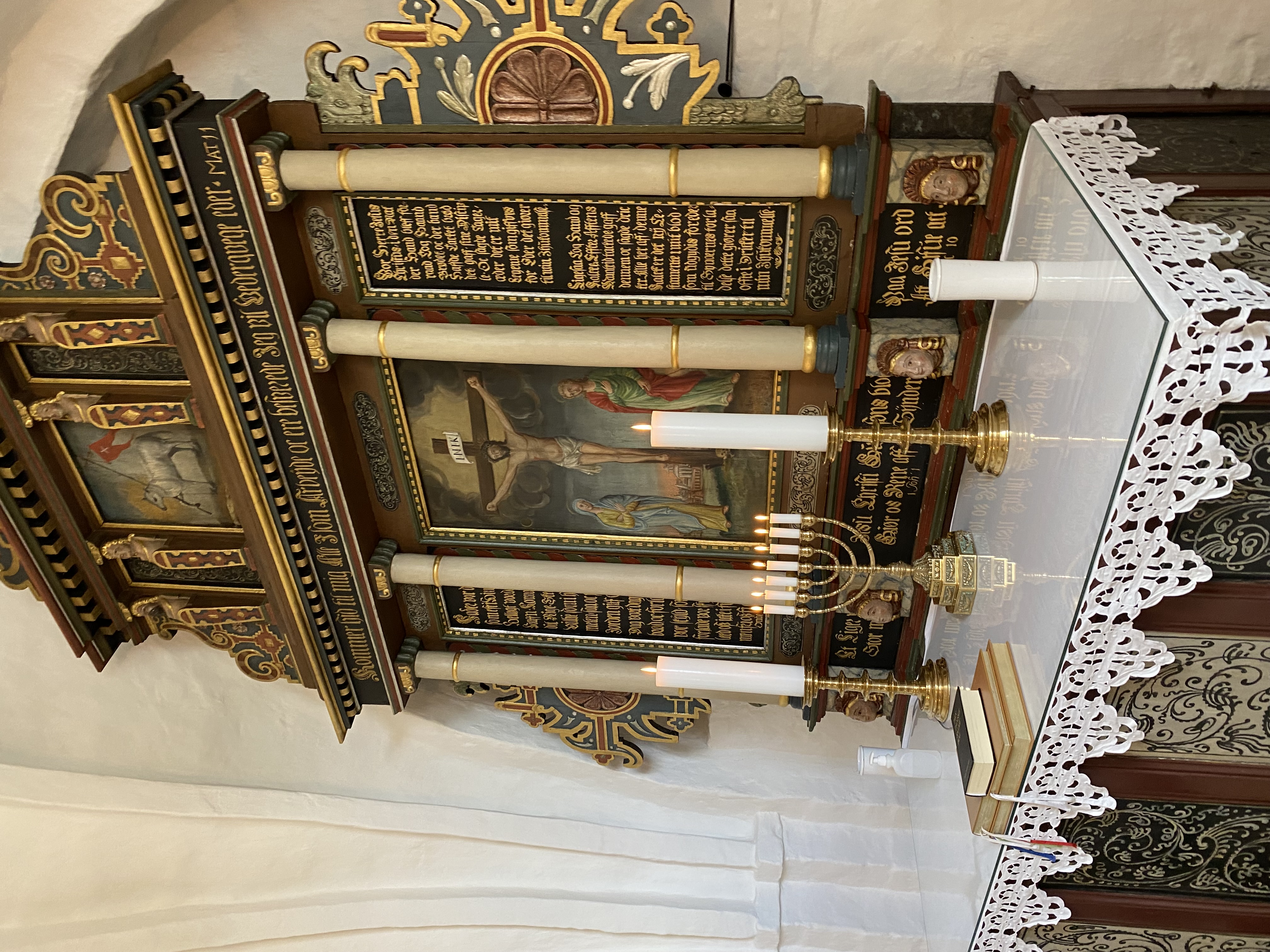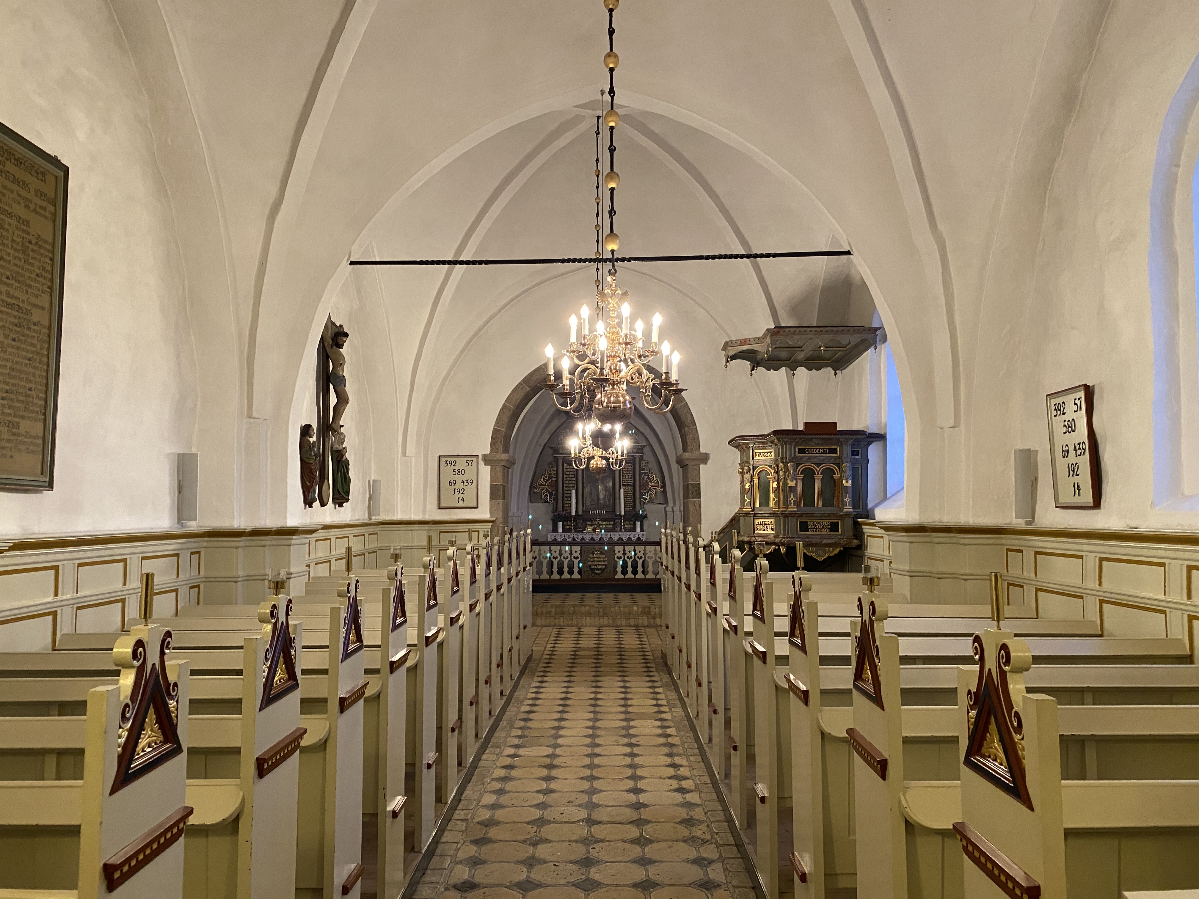 Det sen-gotiske krucifiks med sidefigurer, anbragt i korbuen, er fra ca. 1525. Ved siden af bemærkes den spændende tavle med navne og årstal på kirkens præster.